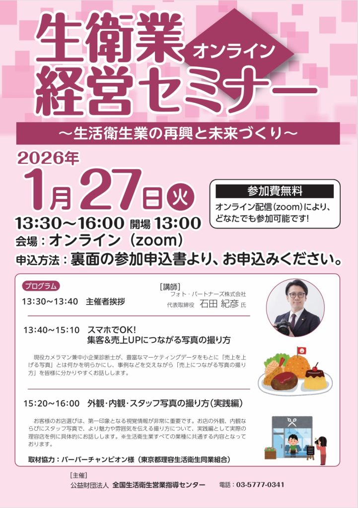 生衛業オンライン経営セミナー 2026年1月14日 最終更新日時 : 2026年1月14日 愛媛県理容生活衛生同業組合 <生活衛生業の再興と未来づくり>2026年1月27日(火)13:30~16:00 開場13:00会場:on-line (Zoom)参加費無料